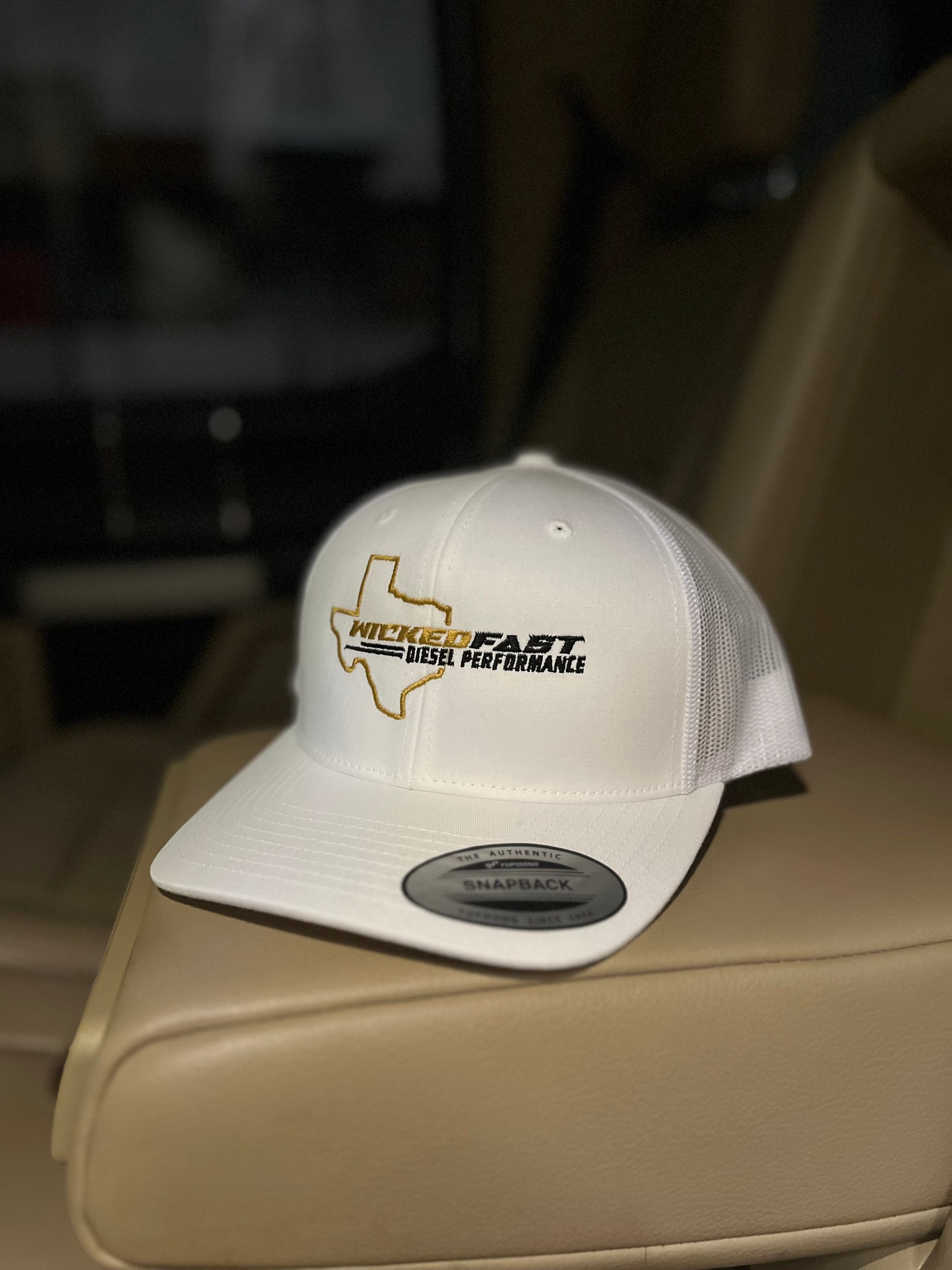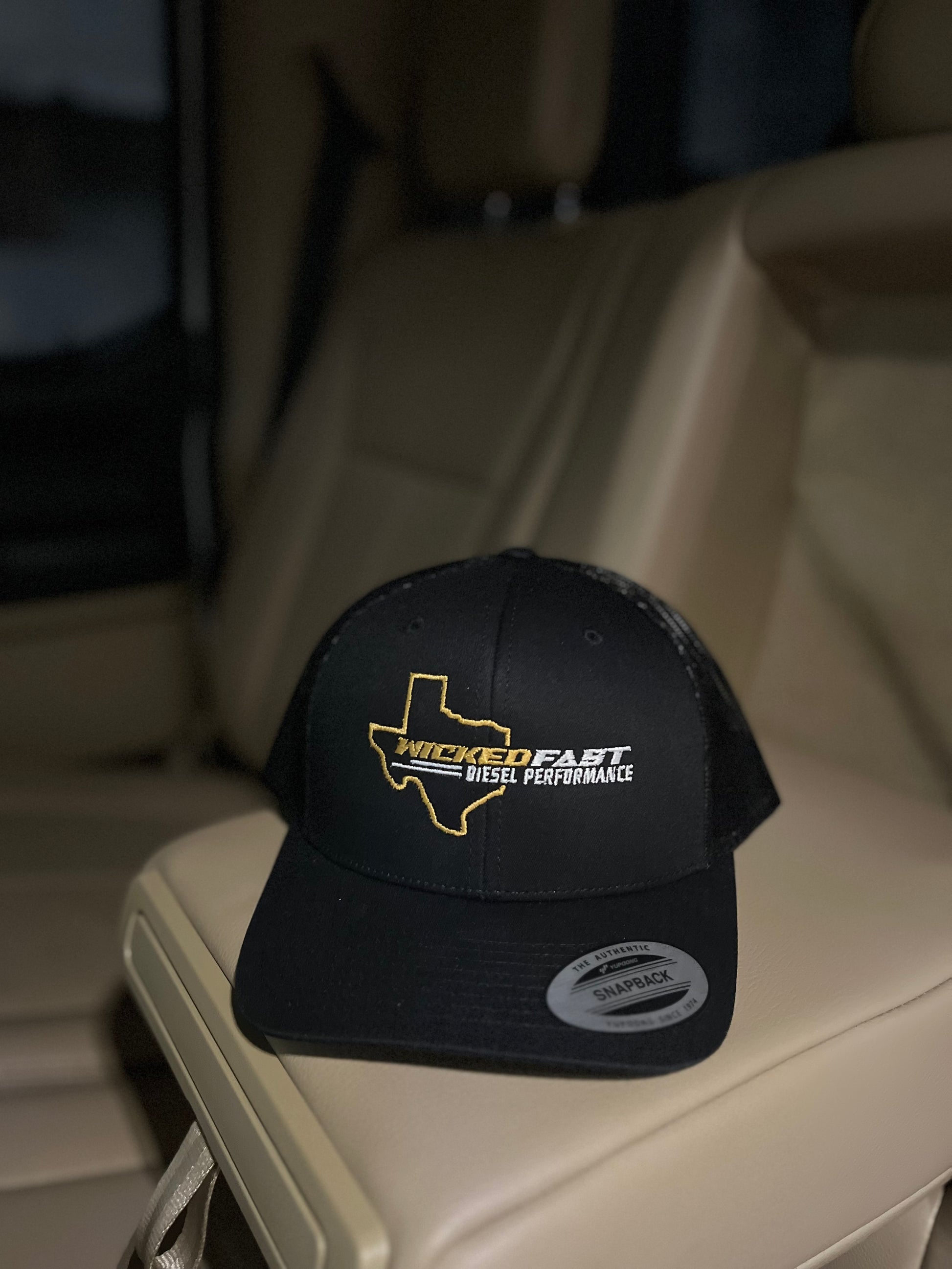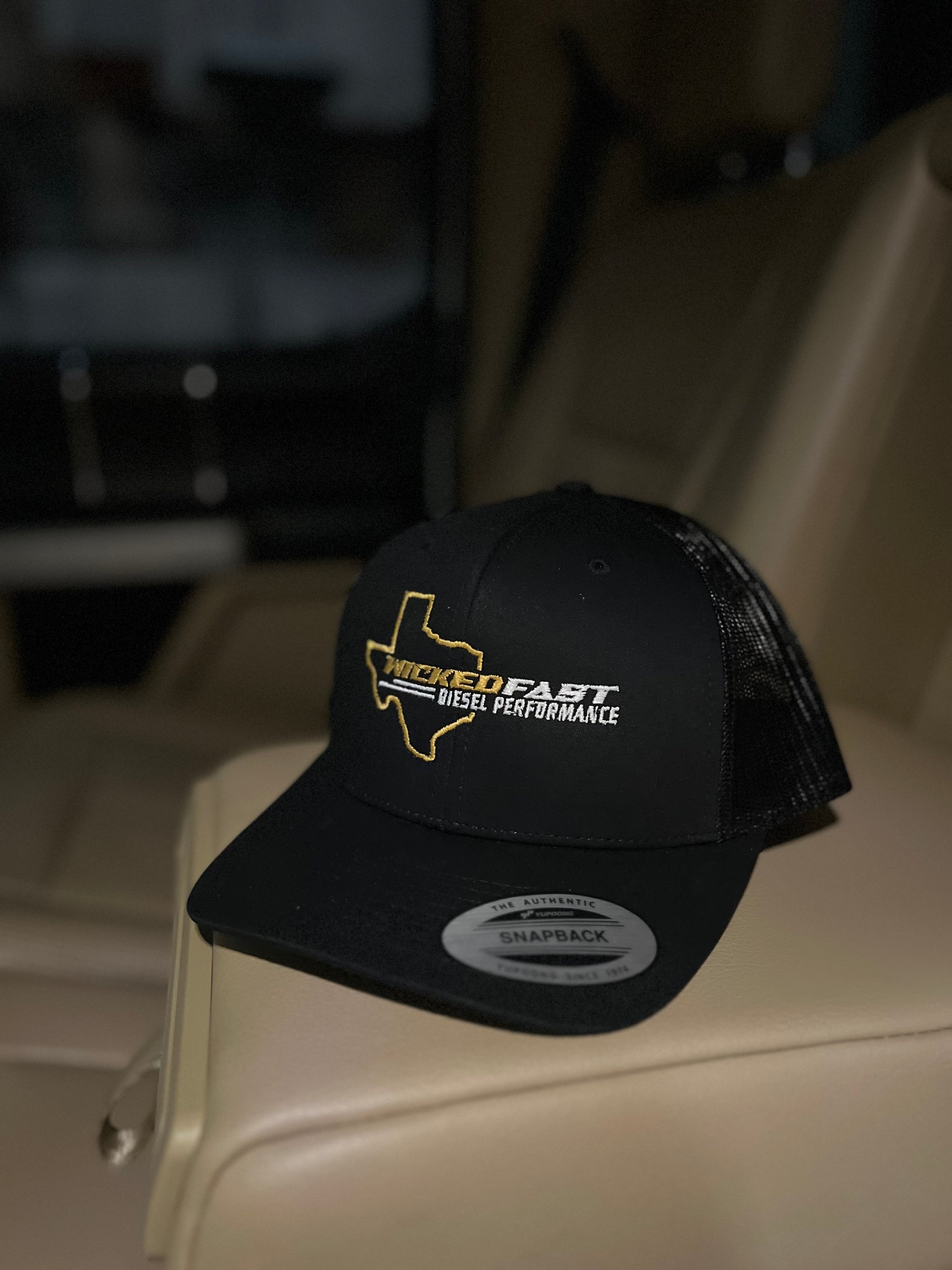 Rep your diesel pride with the Wicked Fast Diesel Performance snapback hat, built for truck owners, mechanics, and diesel enthusiasts. Featuring our bold Texas-outline logo embroidered in black and gold, this hat is perfect for long shop days, weekend truck meets, or cruising backroads.